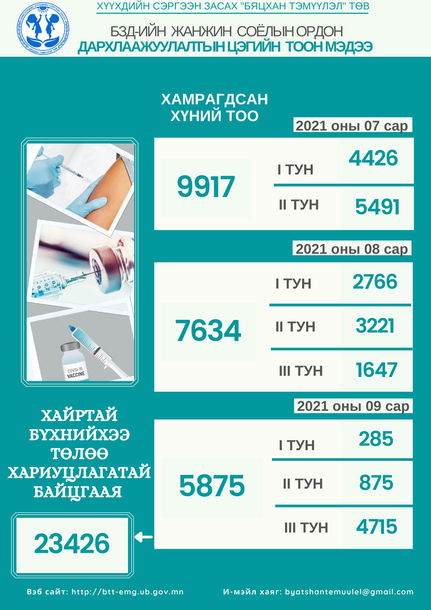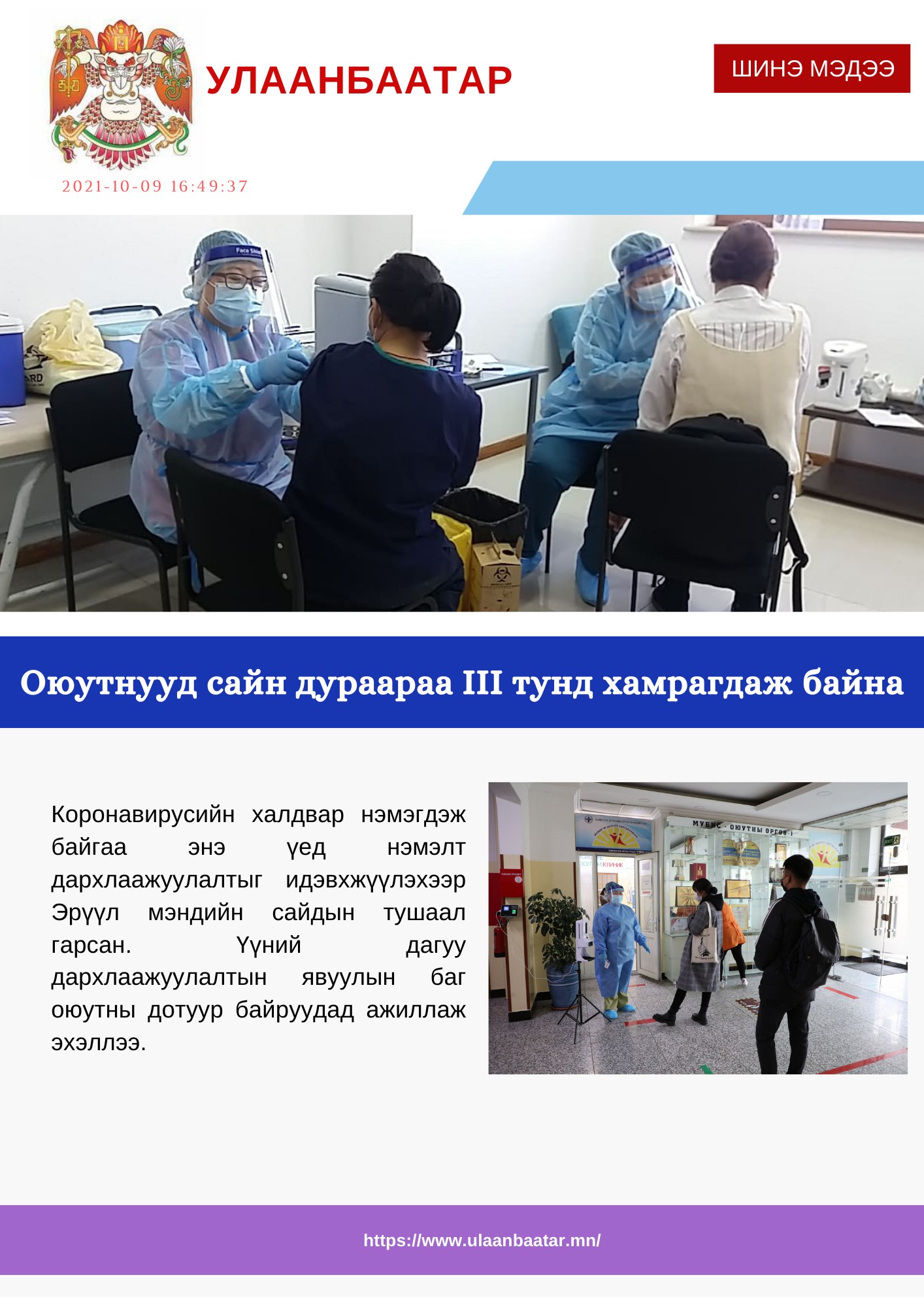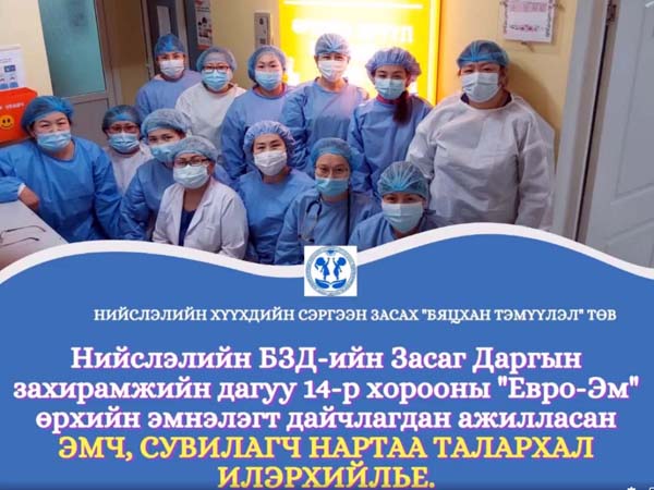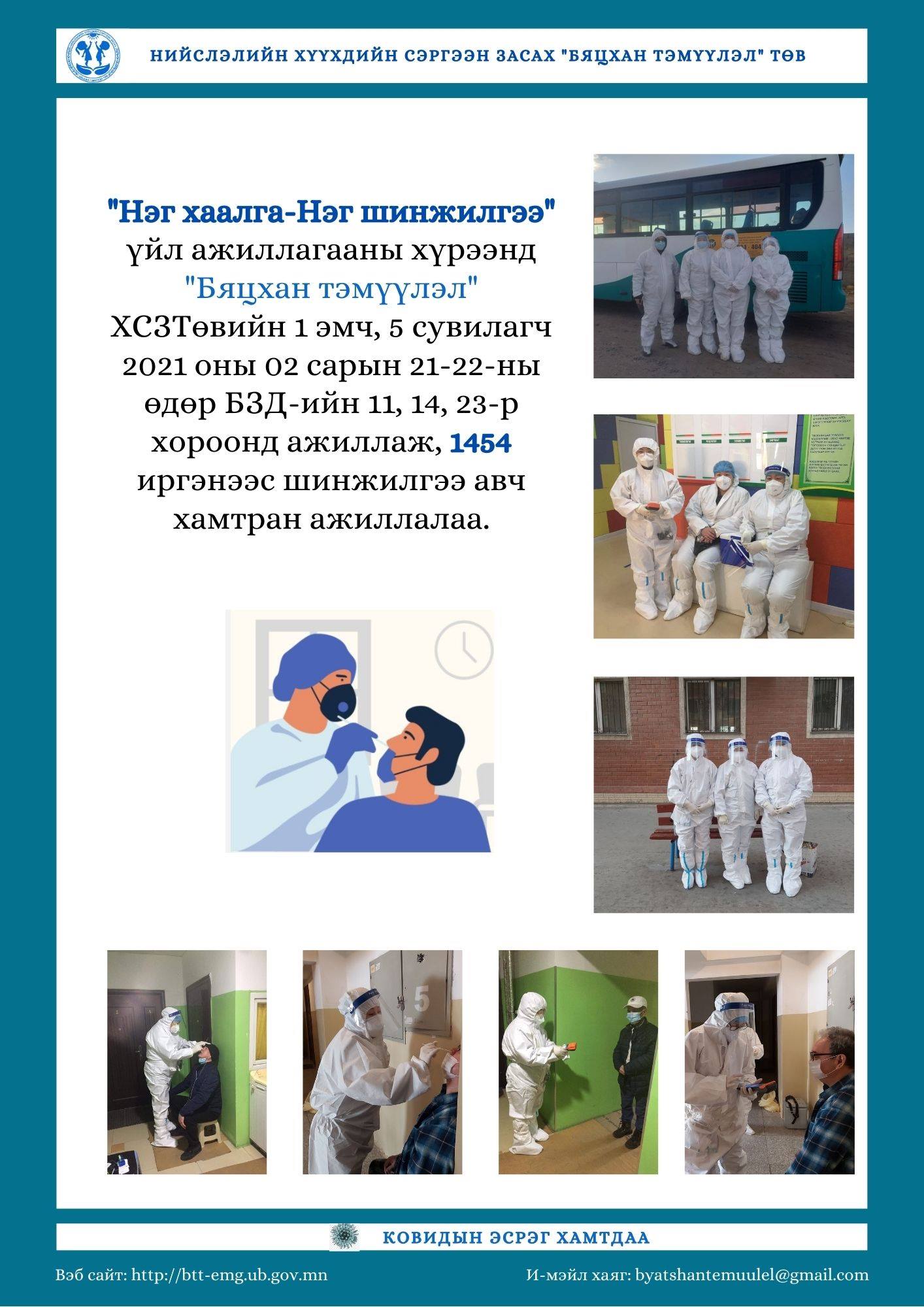 "Нэг хаалга-Нэг шинжилгээ" үйл ажиллагааны хүрээнд "Бяцхан тэмүүлэл" ХСЗТөвийн 1 эмч, 5 сувилагч 2021 оны 2 сарын 21-23-ны өдөр БЗД-ийн 11,14,23-р хороонд ажиллаж, 1454 иргэнээс шинжилгээ авч хамтран ажиллаа.Дэлгэрэнгүй
